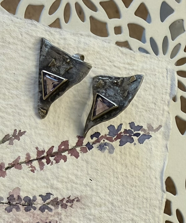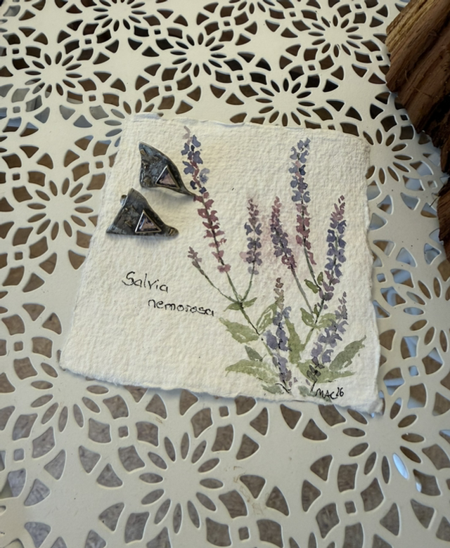 Diese schönen Unikat-Ohrstecker mit zwei herrlichen Amethyst-Dreiecken ziehen alle Blicke auf sich. Sie sind einzigartige handgefertigte Einzelstücke und lassen den Duft von Sommer und Steppensalbei erahnen, der wie die Aquarellskizze zeigt auch wunderbar dazu passt.