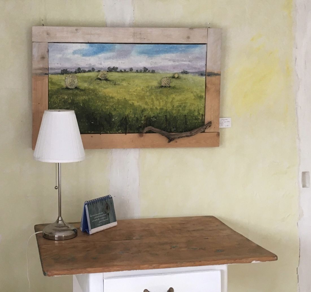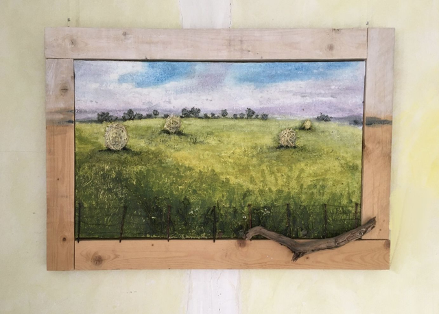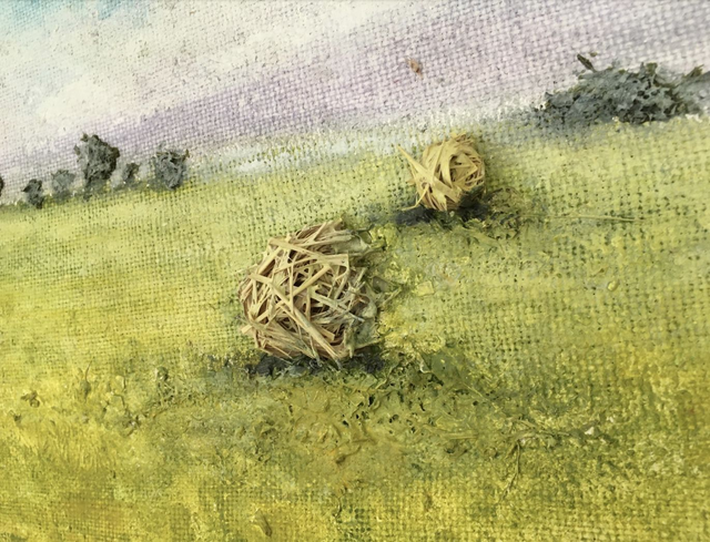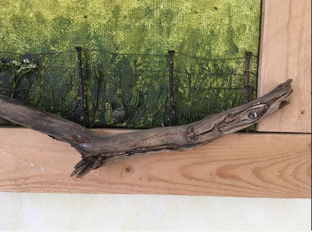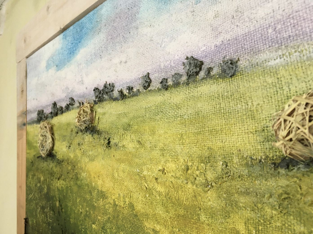 Acrylfabe auf altem Jutestoff, Palettenholzrahmen und Naturmaterial. Eine Sommerimpression der hohenloher Landschaft. 2018 entstanden.
