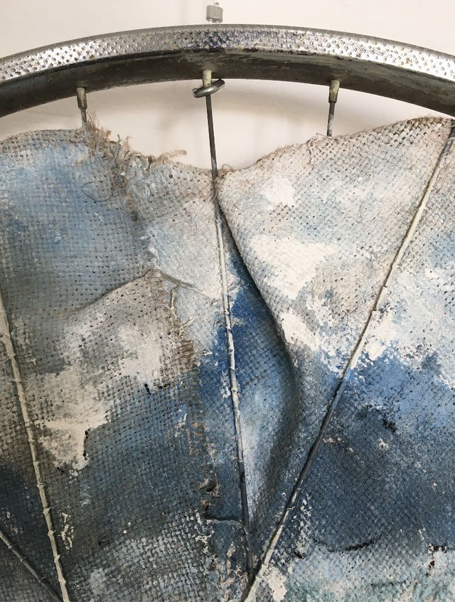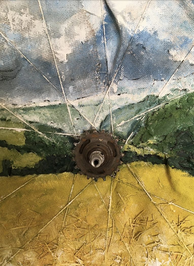 Acrylbild auf Fahrradfelge, die mit altem Sackstoff ausgenäht wurde. In die selbst hergestellte Acrylfarbe wurden Naturmaterialien, wie Steine, Samen, Gras und Schneckenhäuschen eingearbeitet. Das Bild zeigt einen Blick über die Hohenloher Ebene bei Ailringen.