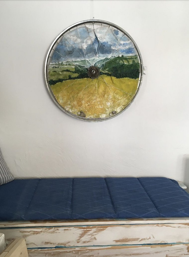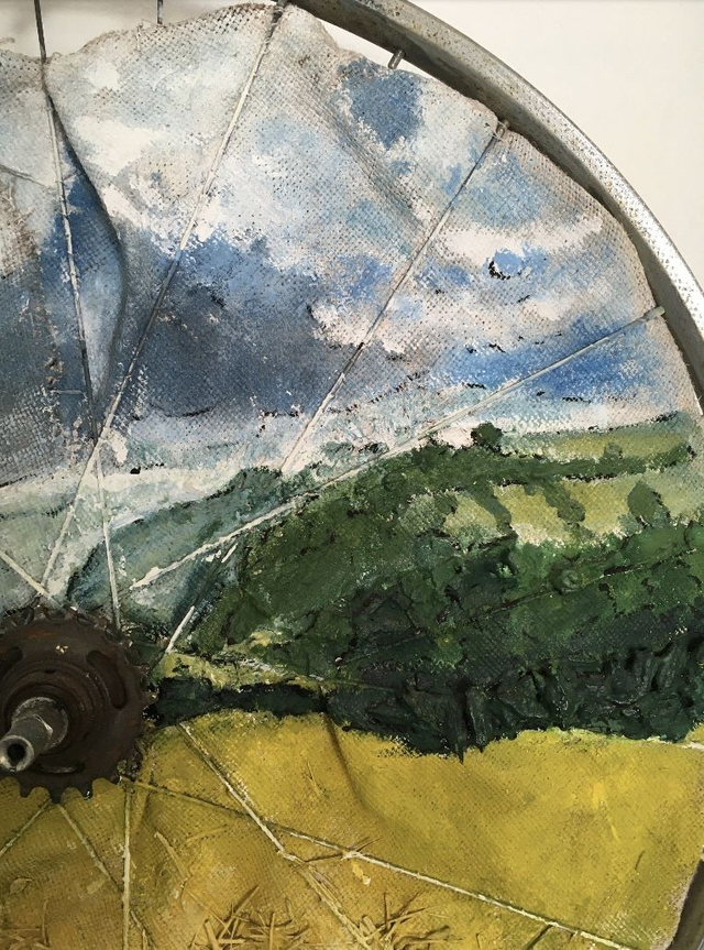 Acrylcollage auf Fahrradfelge „Weites Land“