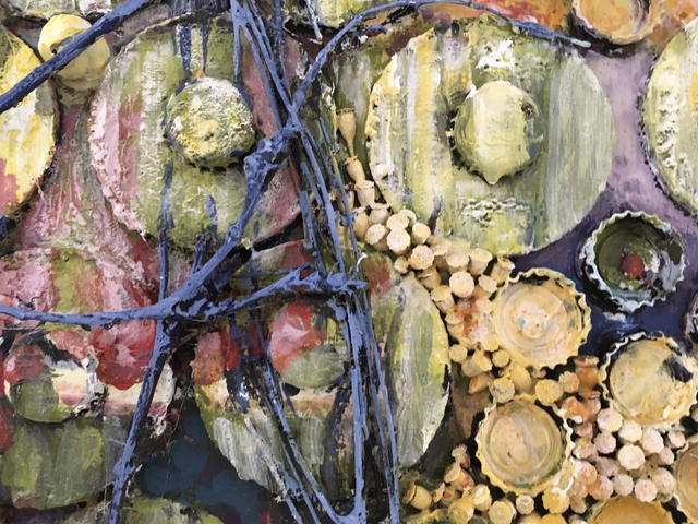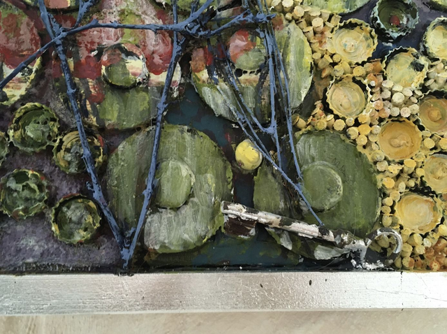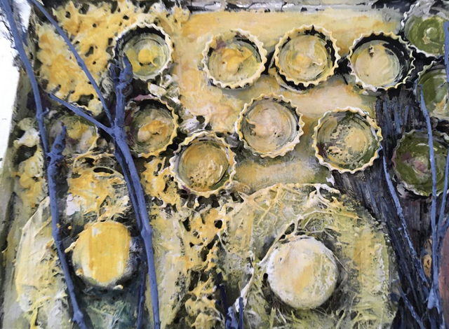 Acrylfarbe auf Hartfaserplatte mit Naturmaterial, Kronkorken, Kunststoffscheiben und Palettenholzrahmen. 2019/2020 gemeinsam mit Hilfe meiner demenzkranken Mutter entstanden.