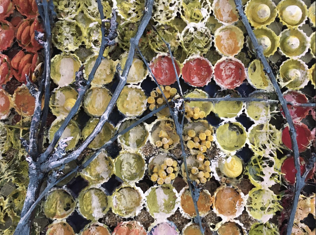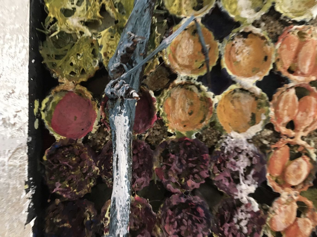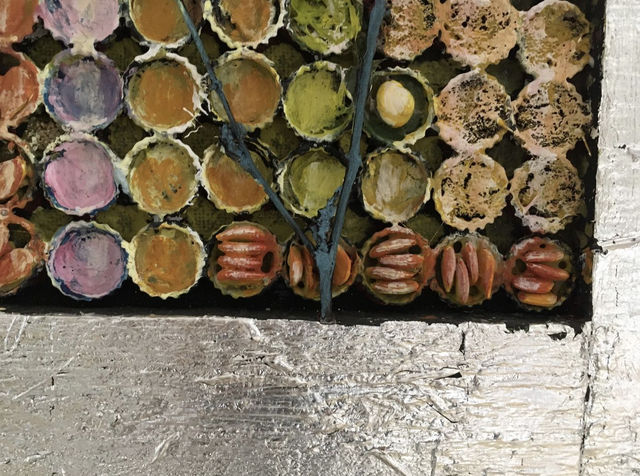 Acrylfarbe auf Hartfaserplatte mit Naturmaterial, Kronkorken, Kunststoffscheiben und Palettenholzrahmen. 2019/2020 gemeinsam mit meiner demenzkranken Mutter entstanden. Größe 47x47cm. Es symbolisiert und zeigt wie die geraden Strukturen eines Gartens langsam verschwimmen und sich das Chaos, das in zunehmendem Maße im Kopf herrscht sich auch im Garten widerspiegelt.