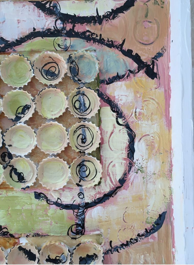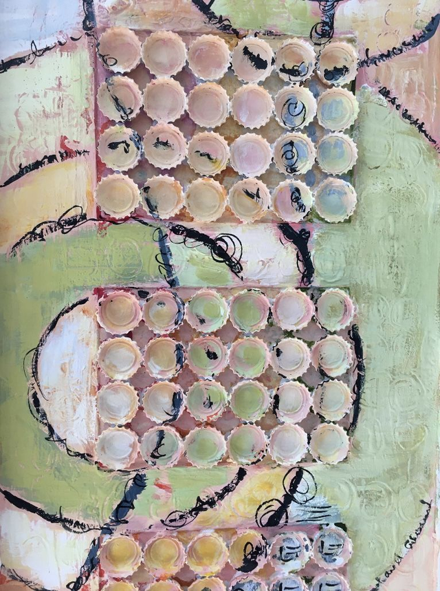 Acrylfarbe auf Hartfaserplatte mit Kronkorken. Die mit sommerlich gestaltete Acrylcollage wird von kreisförmigen Mustern dominiert, die harmonisch die warme weiche Luft des Sommers symbolisieren und die eingearbeiteten Kronkorken umschmeicheln, wie ein warmer Wind an einem Sommerabend im Garten.