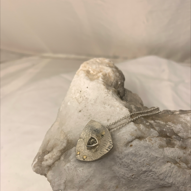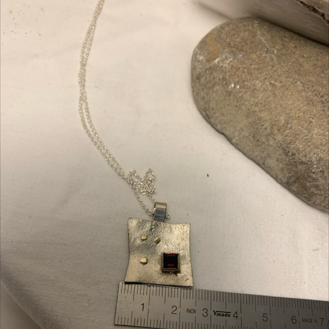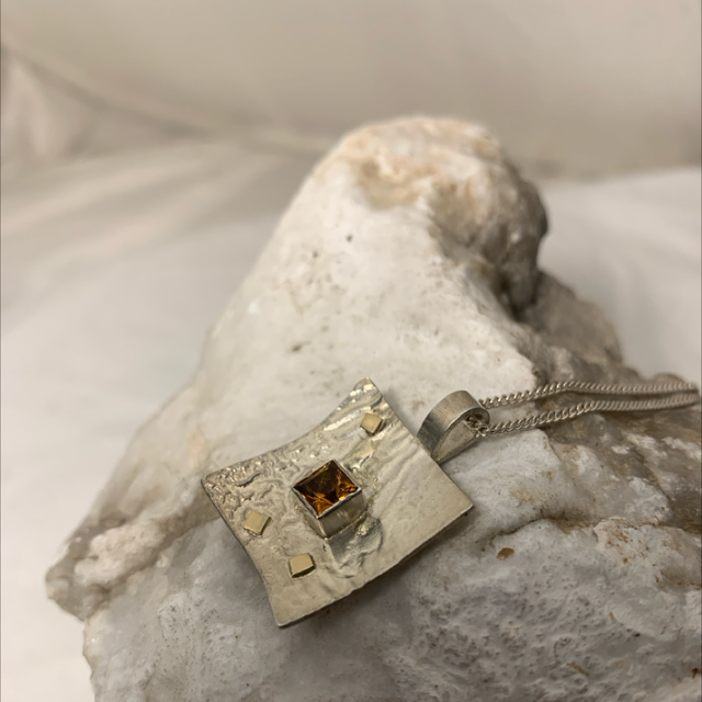 Diese hübschen Anhänger aus recyceltem Sterlingsilber erhalten ihre einzigartige Struktur durch eine besondere Überschweißtechnik. Die Edelsteine werden durch kleine Eckchen aus 333/- er Gelbgold unterstrichen. Die Anhänger sind ohne Kette.