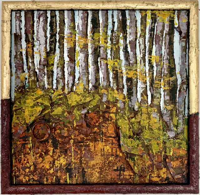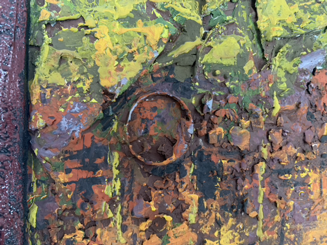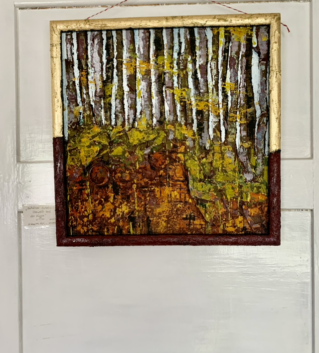 Dieses Collage aus aufgesammeltem Plastikmüll, Eierschalen, … wurde 2024 auf einen recycelten Keilrahmen 40x40cm gemalt. Es ist Teil des Zyklus „Schöner Schein- Umwelt auf der Kippe“ und thematisiert unser idyllische, scheinbar heile Heimat im Jagsttal.