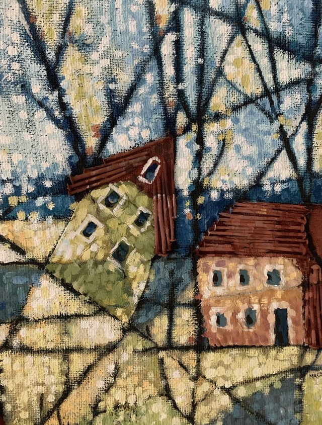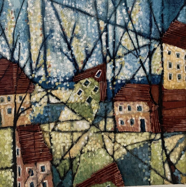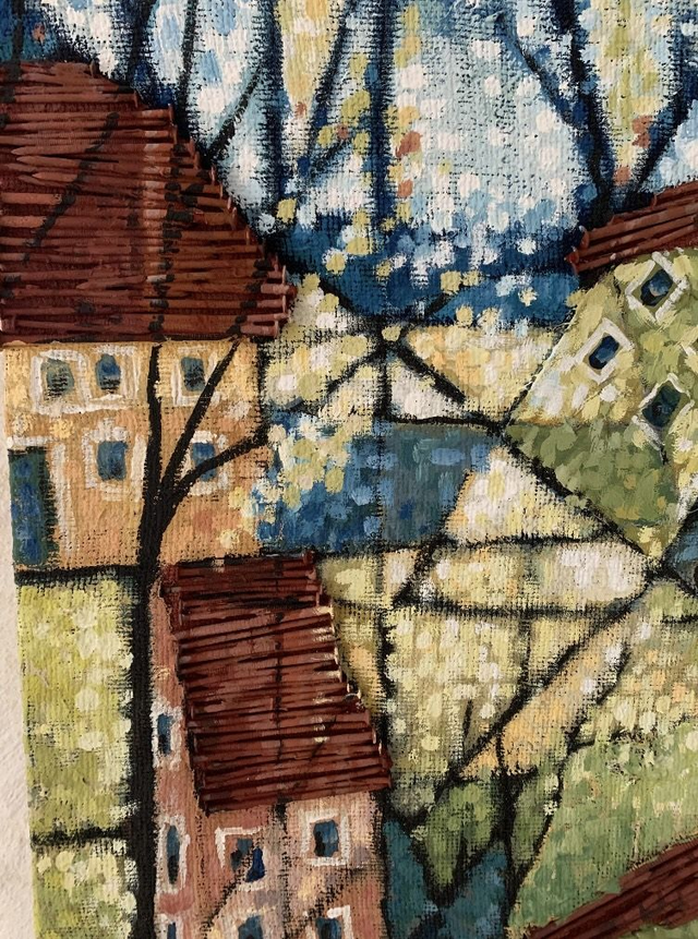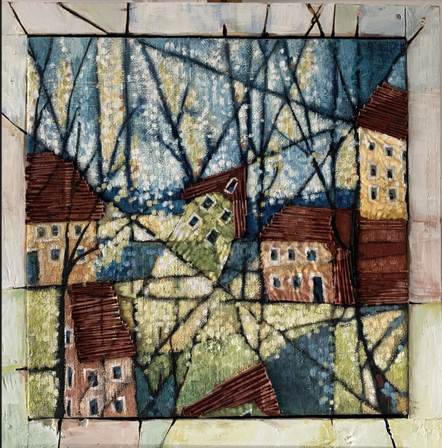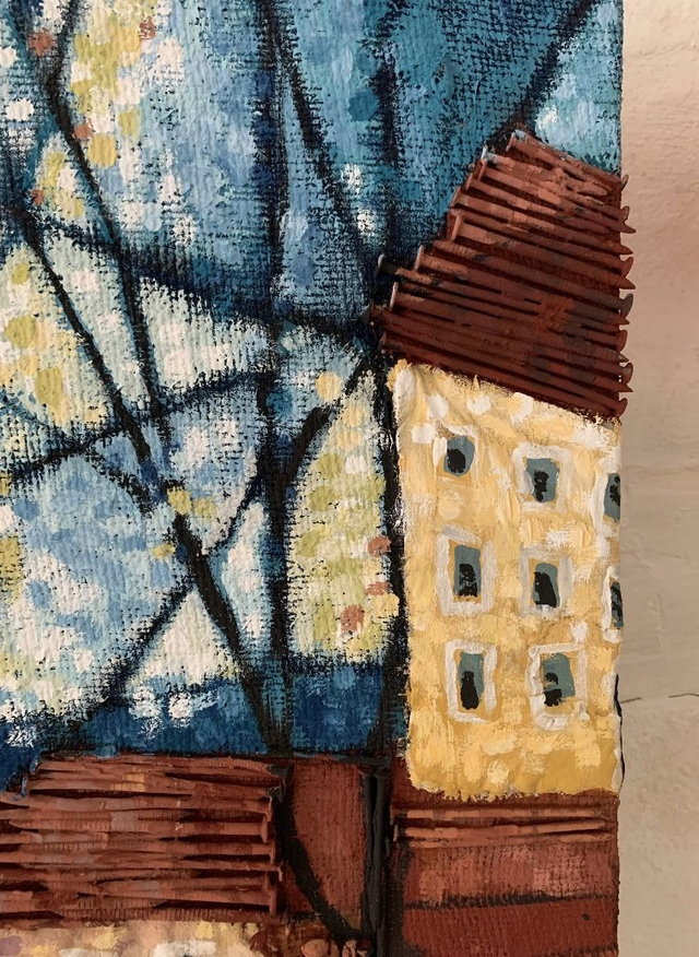 Dieses abstrakte Gemälde aus Eitempera ist auf einem handgefertigten Keilrahmen aus altem Palettenholz entstanden. Die Jute stammt von einem alten Jutesack mit Löchern und Flicken, die in das Gemälde integriert sind. Die Stadtansicht ist von Bergen, Norwegen, inspiriert und abstrakt umgesetzt. Die Dächer sind mit recycelten Palettennägeln strukturiert.