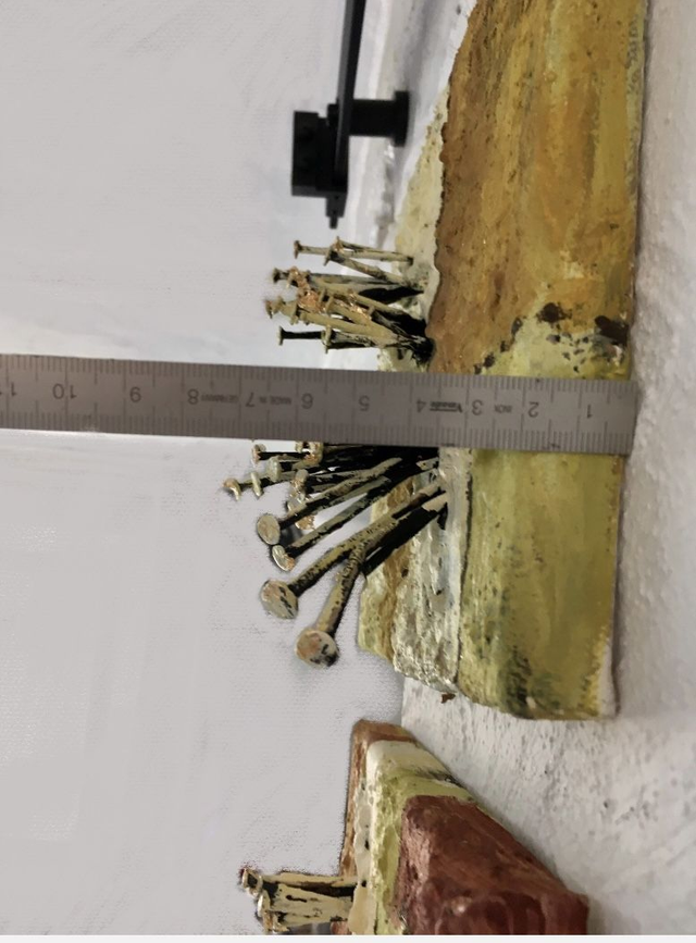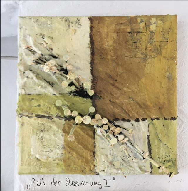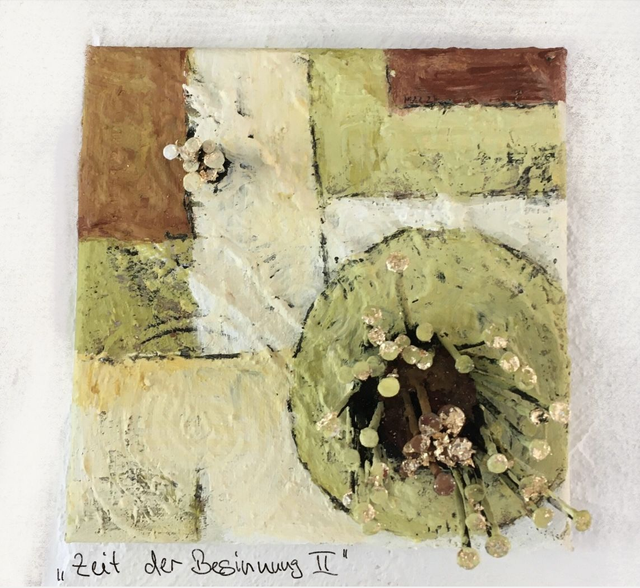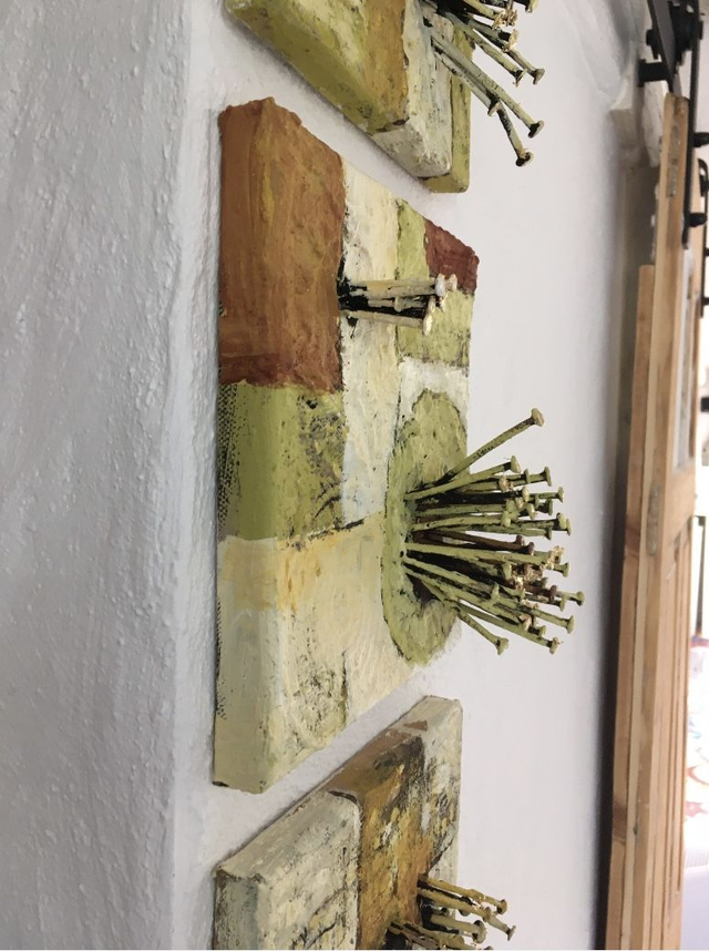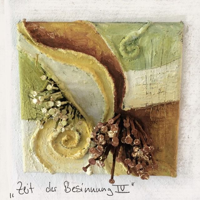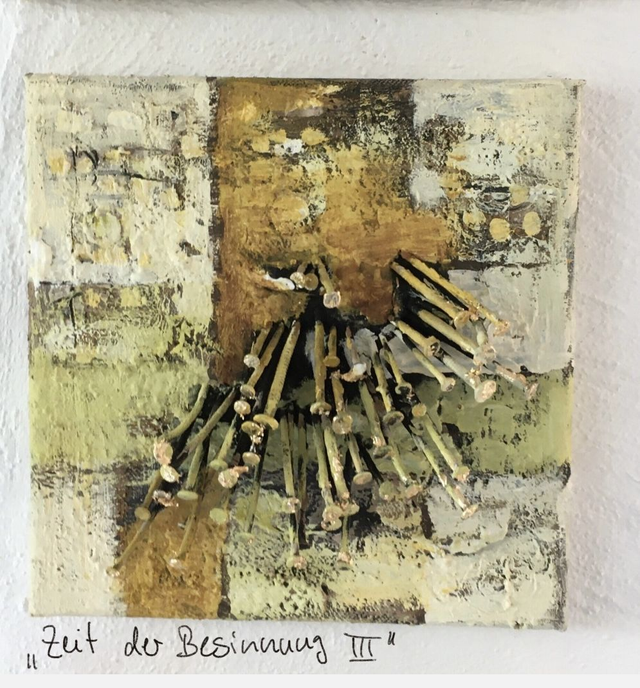 Eitempera-Vierteilige Serie „Zeit der Besinnung I-IV“ Eitempera und Palettennägel auf Leinwand je 20x20cm