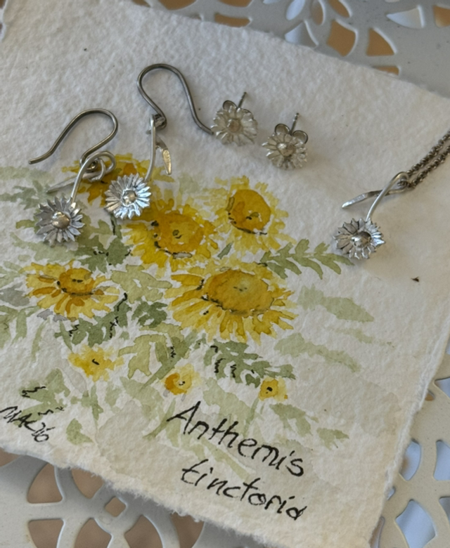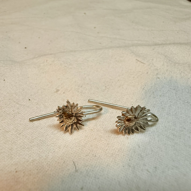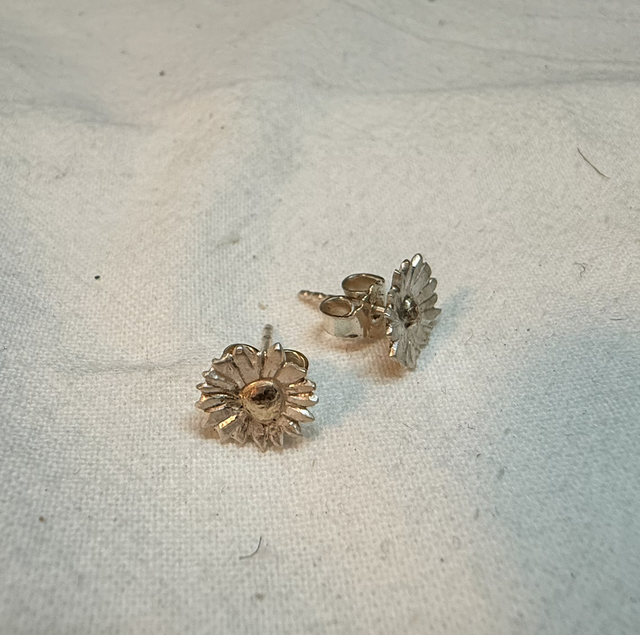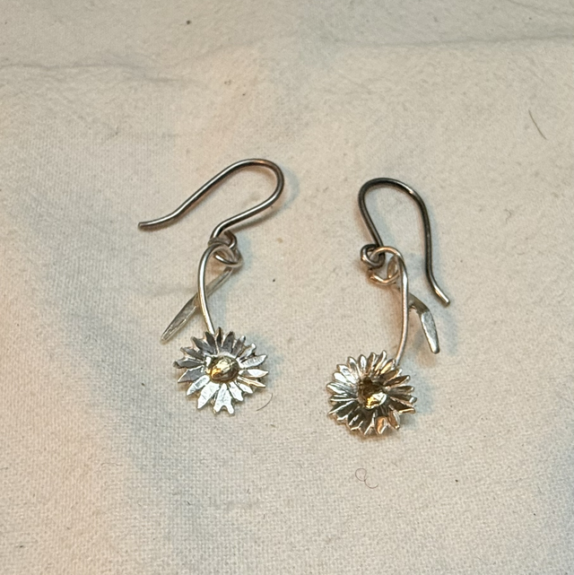 Diese Gänseblümchen aus Silber mit einer 333/- Gelbgoldmitte sind kleine, handgefertigte Unikate, keines ist wie das andere. Sie dind als Stecker, mit einem geschlossenen Ohrhaken oder mit offenen Ohrhaken erhältlich. Die Größe der Blüten ist ca. 9mm mit Stil und Blatt ca. 20mm lang,