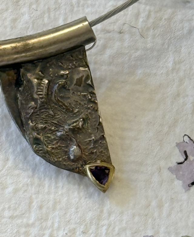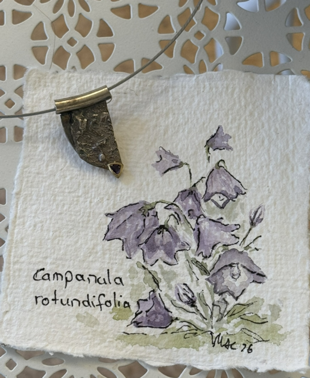 Dieser schöne Anhänger wurde aus recyceltem Silber hergestellt und mit alten Besteckfragmenten aus Silber überschweißt. Der Amethyst ist in Dreiecksform und in 585/- Gold gefasst. Der Anhänger wird ohne Kette oder Collier geliefert. Die Aquarellskizze zeigt die rundblättrige Glockenblume Campanula rotundifolia, die wunderbar dazu passt.